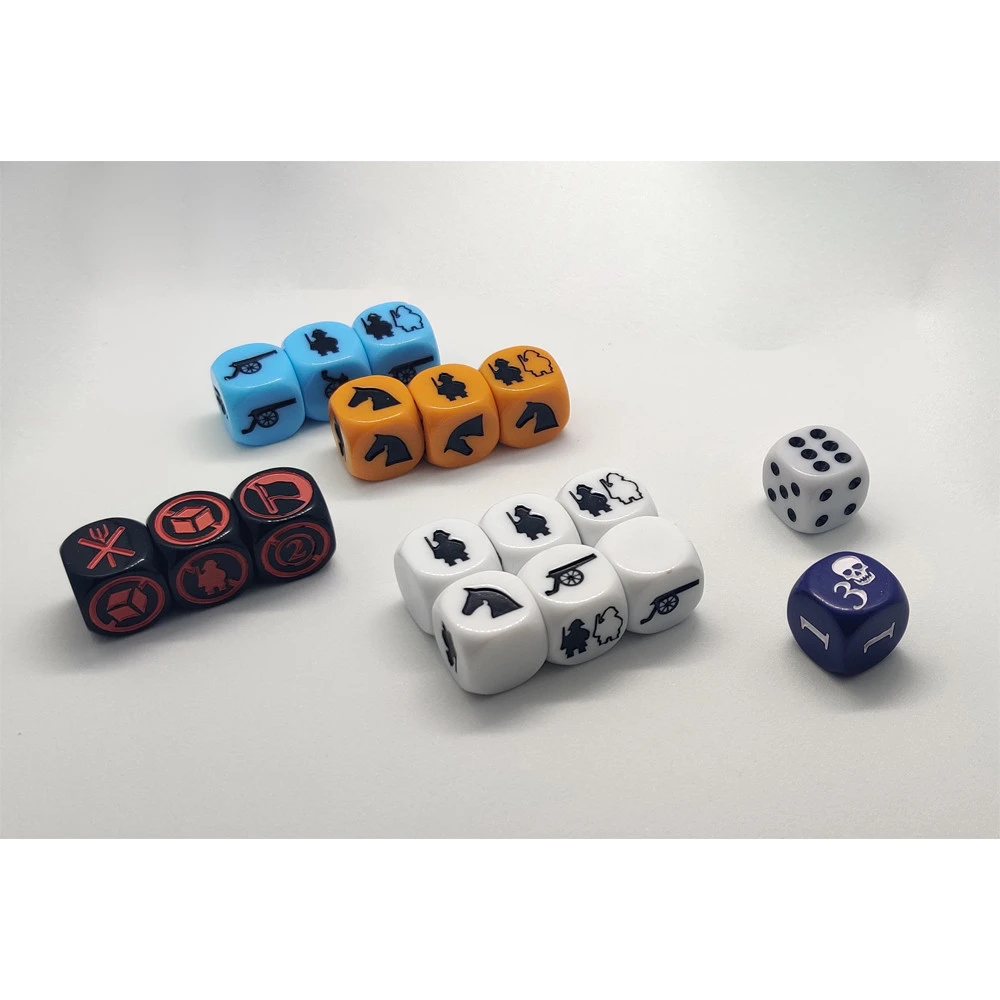 An extra set of dice, including 12 battle dice (6 infantry dice, 3 cavalry dice, 3 artillery dice), 3 rebel dice and 1 exploration die.