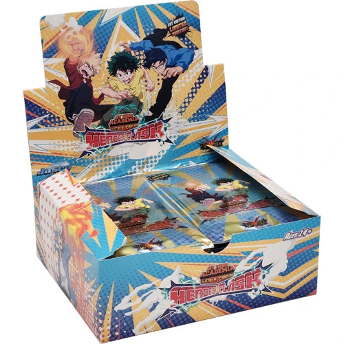 This display contains 24 booster packs of 10 cards each for the My Hero Academia CCG, 1 box topper promotional card, and 2 Quirk Pack promotional packs.