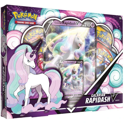 Galarian Rapidash V is known for the devastating Psychic-type attacks it sends out from its long, spiraling horn – and now that power can be yours! Alongside a playable foil promo card featuring this pretty pastel Poké, plus an oversize card suitable for display, you’ll find extra treasures in a handful of Pokémon TCG booster packs. Chase down this forest beauty with the Poké TCG: Galarian Rapidash V Box!