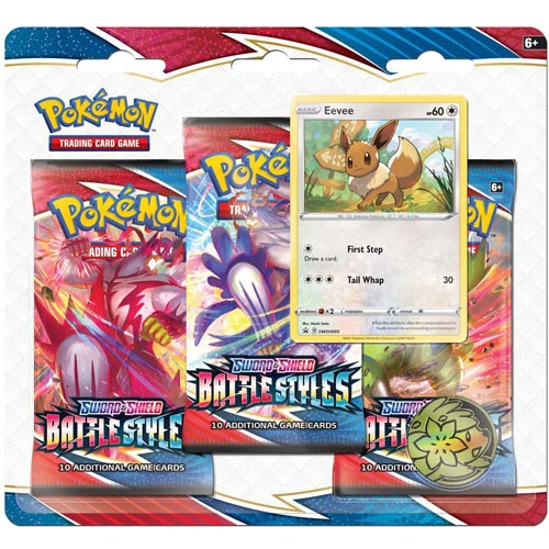 This blister includes three Pokémon TCG: Sword & Shield – Battle Styles booster packs, a foil promo card featuring Eevee, a cool Pokémon coin to add to your collection, and a code card for the Pokémon Trading Card Game Online!