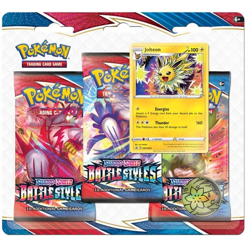 This blister includes three Pokémon TCG: Sword & Shield – Battle Styles booster packs, a foil promo card featuring Jolteon, a cool Pokémon coin to add to your collection, and a code card for the Pokémon Trading Card Game Online!