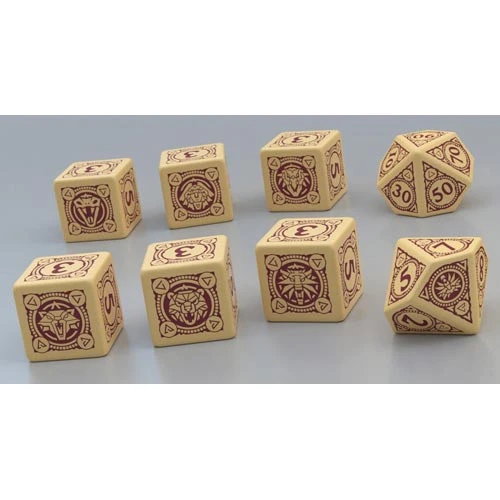 The set comes with six d6s, each of which features the logo of a different witcher school and two d10s, one standard and one percentile.