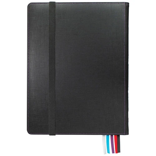 The textured leatherette cover features a rigid layer of protection for both the front and back of the book, while remaining flexible at the binding for ease of use. Simply slip the back cover into the back inner pocket and use the front elastic strap to either hold the front cover open, or secure the book closed by pulling it over the back cover. Easily reference important pages marked by 5 attached and color-coded ribbons (black, red, blue, purple, & white).