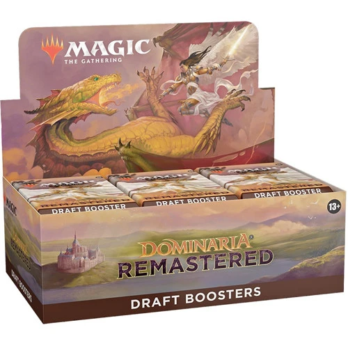 The Dominaria Remastered Draft Booster Box contains 36 Dominaria Remastered Draft Boosters. Each Draft Booster Pack contains 15 cards and 1 token/ad card, including 1 card of rarity Rare or higher and 2-4 Uncommon, 9-11 Common, and 1 Retro Land cards. Traditional Foil of any rarity replaces a Common in 33% of boosters.